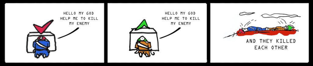 Two soldiers from enemy nations each turn to their god in their respective places of worship, praying for divine help to kill the enemy. Their gods grant these requests.