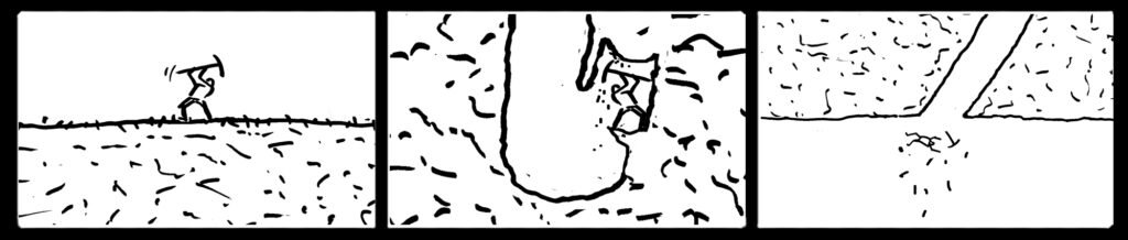 The short animation, DIG, depicts a solitary figure repeatedly striking the ground with a pickaxe. Initially working on the surface, the figure slowly descends, becoming enclosed by the very earth they are attempting to penetrate. This descent deepens until the surrounding material begins to contort into flowing, handwritten letters—the single word “WHY”. The persistent, rhythmic action of digging transforms from a physical task into a metaphorical quest, culminating in an encounter with a profound, yet ultimately nonsensical, question.
