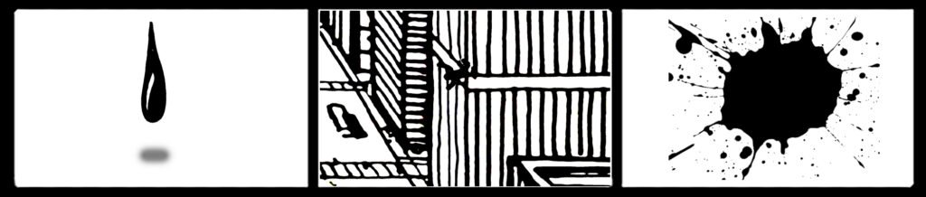 The central idea of DROP DEAD lies entirely in the fascination of a single drop of ink and the immediate pull it creates for us to visualize a story.