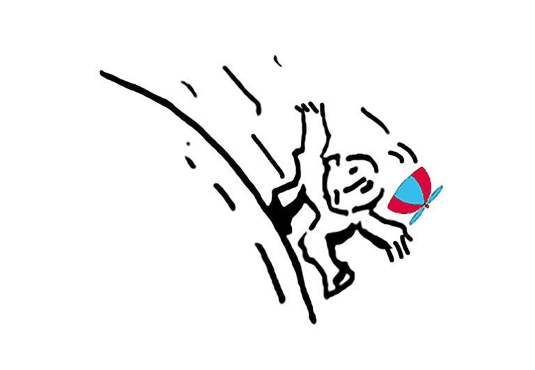 A seemingly carefree figure struts confidently across a surface, only to suffer a sudden slip and tumble into a relentless, terrifying descent. The figure crashes repeatedly from one plane to another, then another, until their fall ceases to be physical and transforms into an endless, dizzying drift among the uncountable planets scattered across the infinite cosmos.