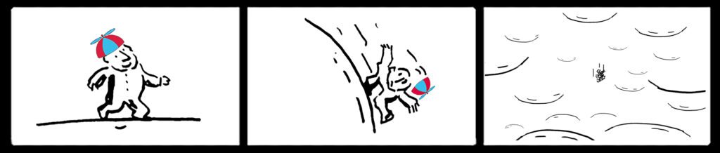 The brevity of FALL (just 28 seconds) makes its impact highly concentrated. The intentional contrast between the dark theme and the playful, hand-drawn visuals highlights the power of our low-tech method to explore deep existential questions with visual economy and stylistic charm.