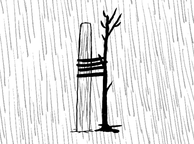 A small sapling is tenderly tied to a wooden post, meant to offer protection as it matures. The rain pours down relentlessly, nourishing the scene—yet it is not the sapling that grows. Instead, the wooden post stretches and expands, engulfing everything around it in a sudden, illogical surge of mass, while the sapling remains stubbornly just a sapling.