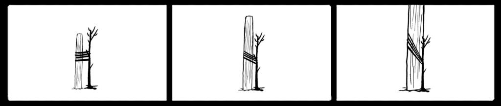 A small sapling is tenderly tied to a wooden post, meant to offer protection as it matures. The rain pours down relentlessly, nourishing the scene—yet it is not the sapling that grows. Instead, the wooden post stretches and expands, engulfing everything around it in a sudden, illogical surge of mass, while the sapling remains stubbornly just a sapling.