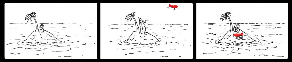 A person is stranded and isolated on a tiny island. A plane appears in the sky, completely ignoring the person’s frantic leaps to attract its attention, and flies away. Astonishingly, it returns and lands directly on the island. To the person’s immediate astonishment, the source of their salvation turns out to be nothing more than a small model airplane.